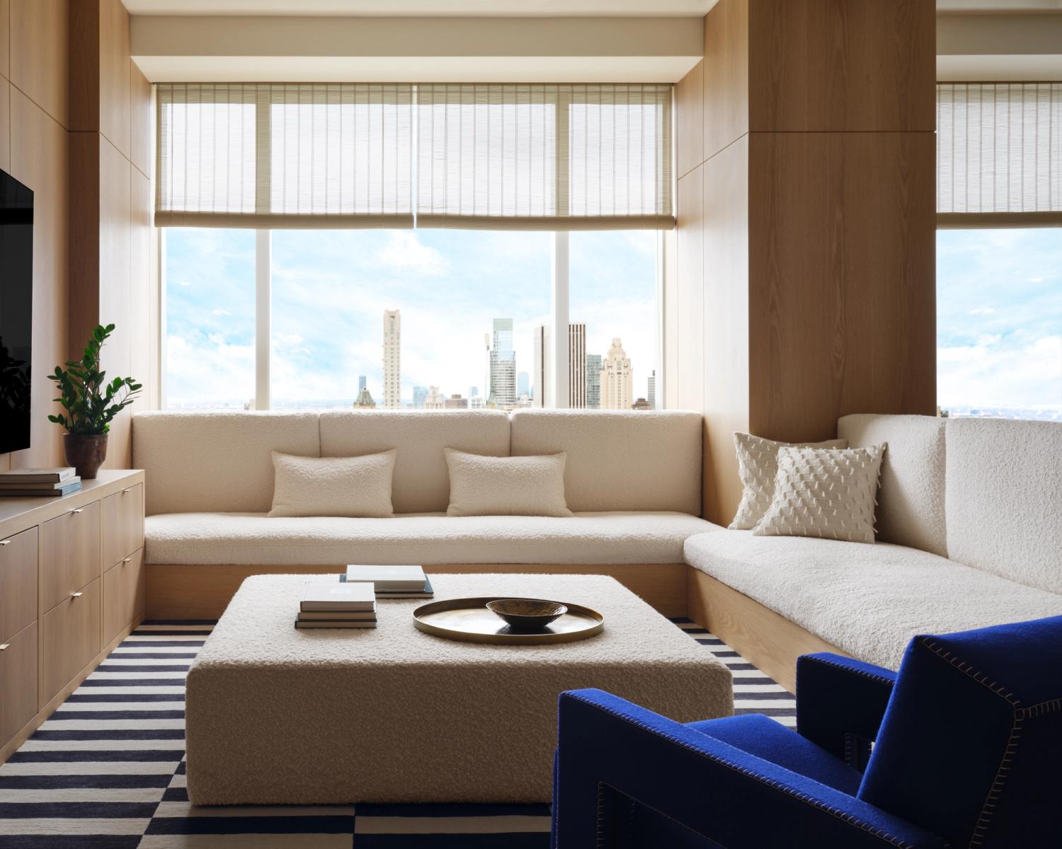 We were appointed by our clients to oversee the redevelopment of two apartments into one large home on the forty seventh floor of an iconic Manhattan residential building. Our role was to be the creative lead in designing a 6,500 square foot home that would serve as a sanctuary high above the city streets. With wrap-around views over Central Park and the Manhattan sky line, our approach was to design a quietly tactile architectural frame of solid oak flooring, textured plaster walls, and honed stone and a selection of collectible vintage and contemporary furniture that imbue a sense of quiet calm and well being